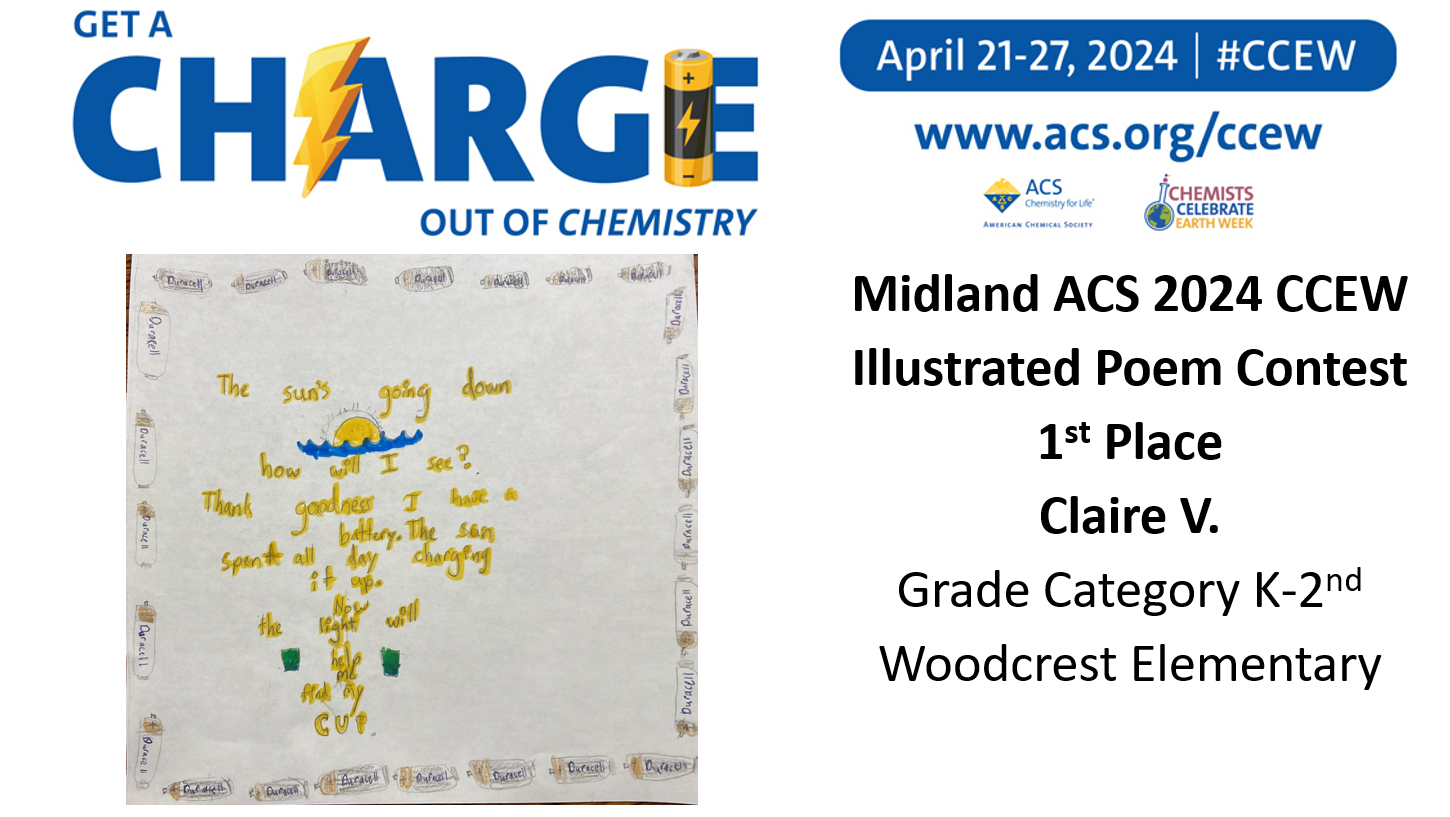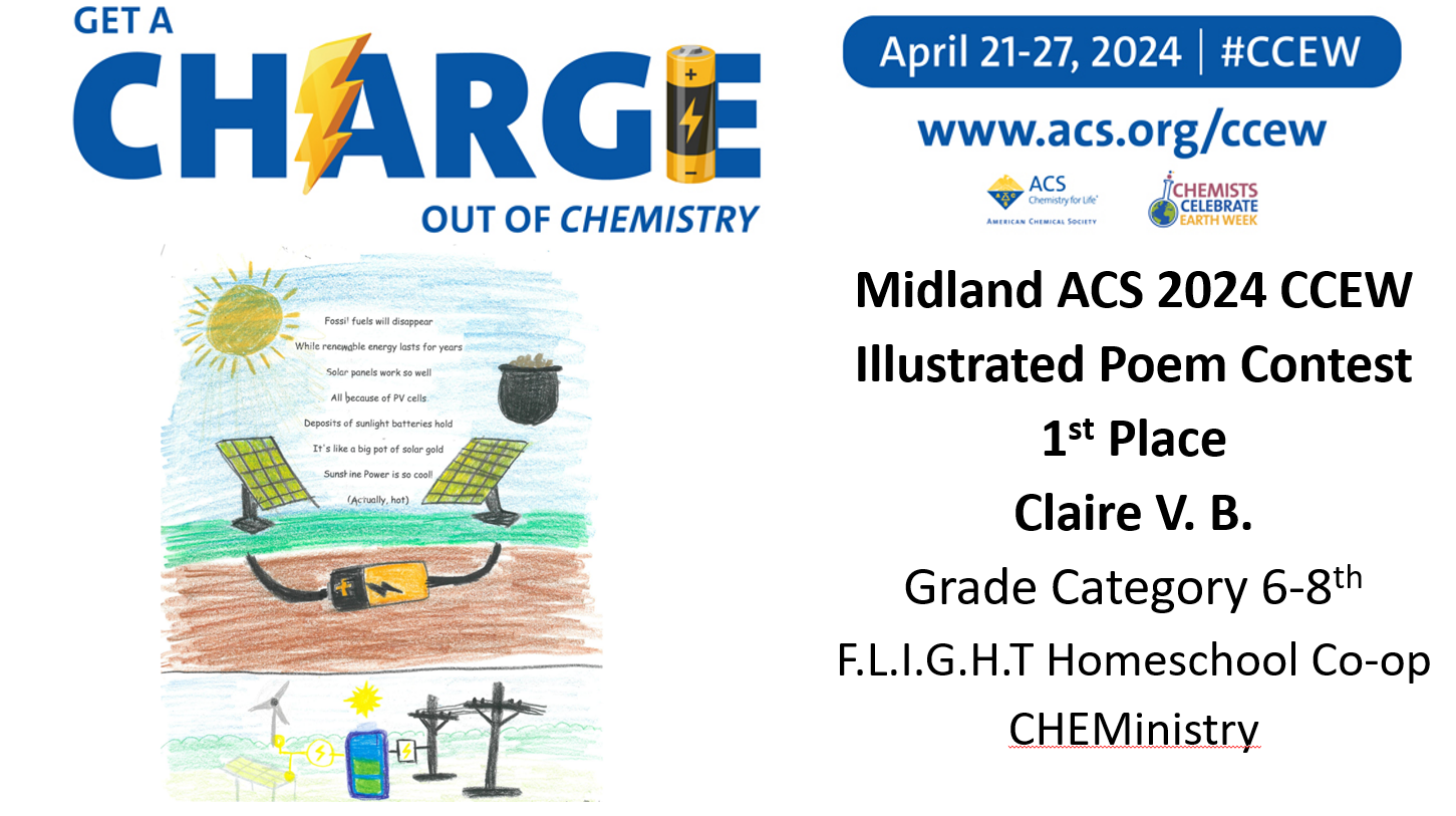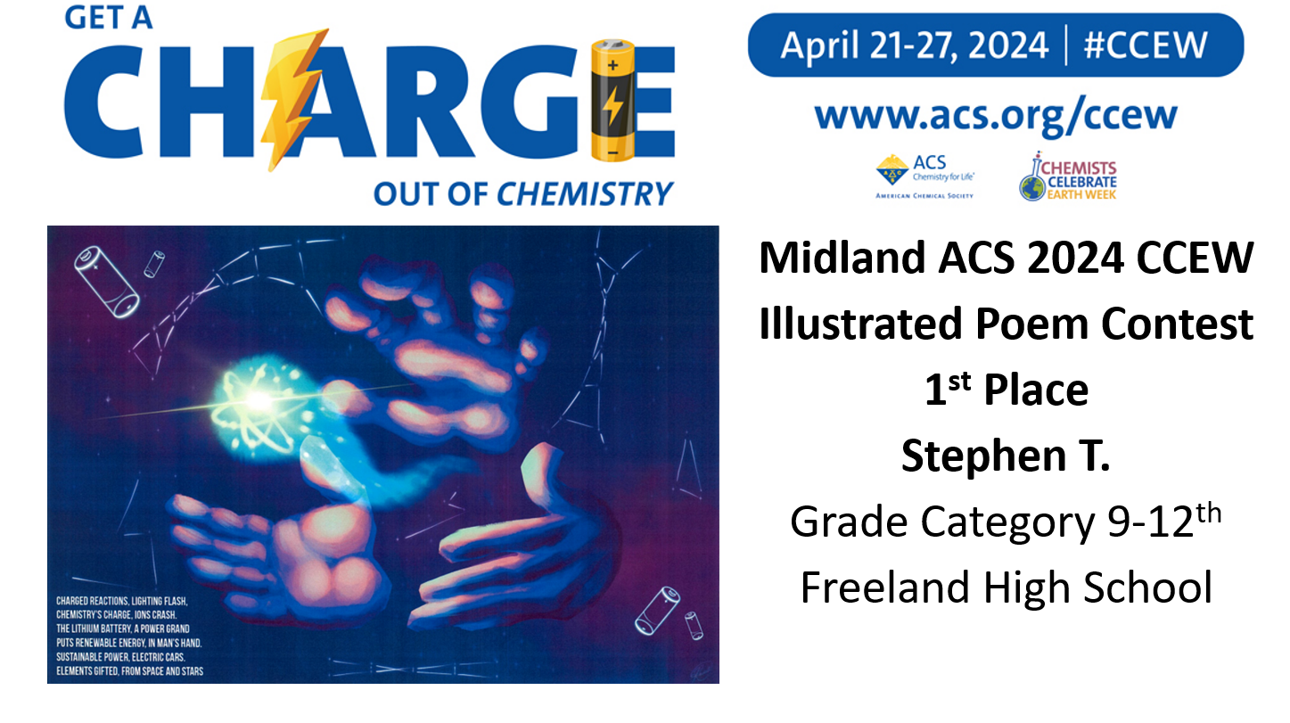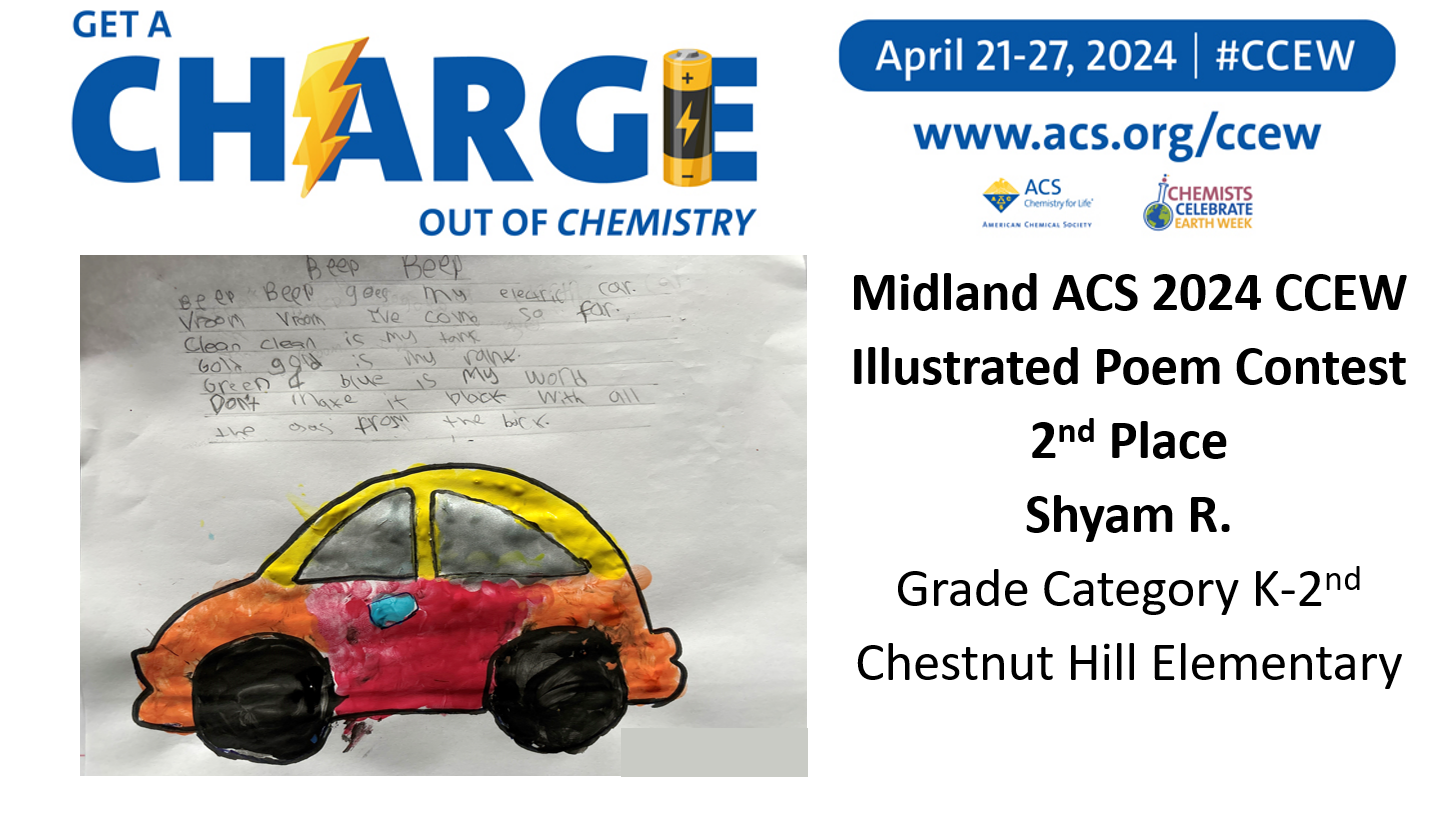 Midland ACS congratulates the winners of our Chemist Celebrate Earth Week (CCEW) Illustrated Poem Contest! Claire V. from Woodcrest Elementary, Shyam R. from Chestnut Hill Elementary, Kaitlyn V. from Woodcrest Elementary, Davarrion R. from F.L.I.G.H.T Homeschool Co-op CHEMinistry, Claire V.B. from F.L.I.G.H.T Homeschool Co-op CHEMinistry, Liam R. from F.L.I.G.H.T Homeschool Co-op CHEMinistry, Stephen T. from Freeland High School, and Wyatt H. from Freeland High School! This year’s theme was “Get a Charge out of Chemistry”