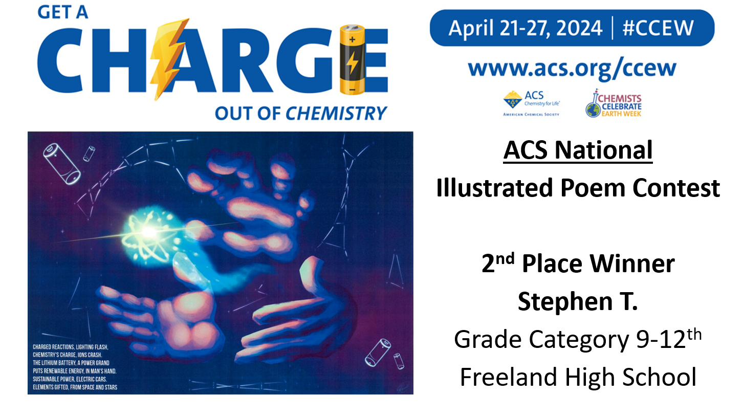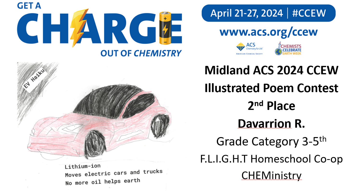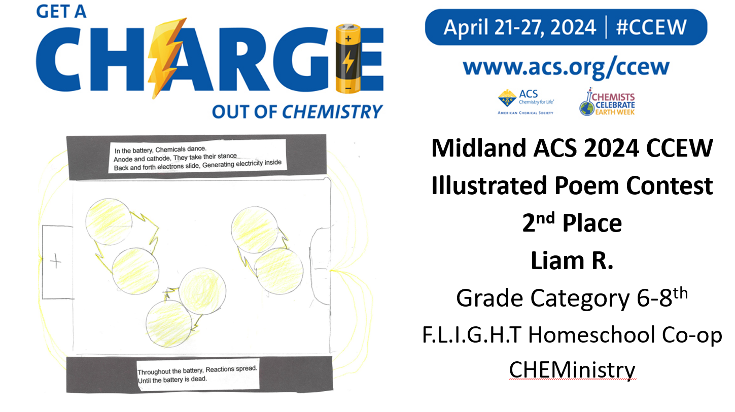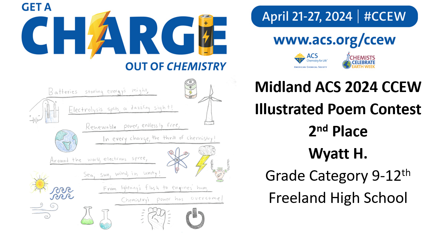 Midland ACS congratulates the winners of our Chemist Celebrate Earth Week (CCEW) Illustrated Poem Contest! Claire V. from Woodcrest Elementary, Shyam R. from Chestnut Hill Elementary, Kaitlyn V. from Woodcrest Elementary, Davarrion R. from F.L.I.G.H.T Homeschool Co-op CHEMinistry, Claire V.B. from F.L.I.G.H.T Homeschool Co-op CHEMinistry, Liam R. from F.L.I.G.H.T Homeschool Co-op CHEMinistry, Stephen T. from Freeland High School, and Wyatt H. from Freeland High School! This year’s theme was “Get a Charge out of Chemistry”