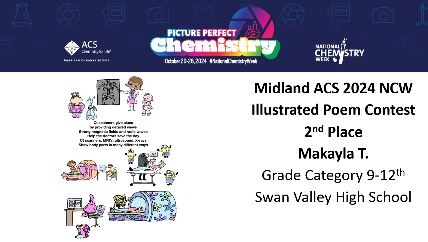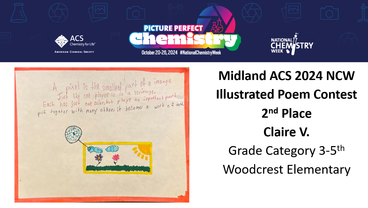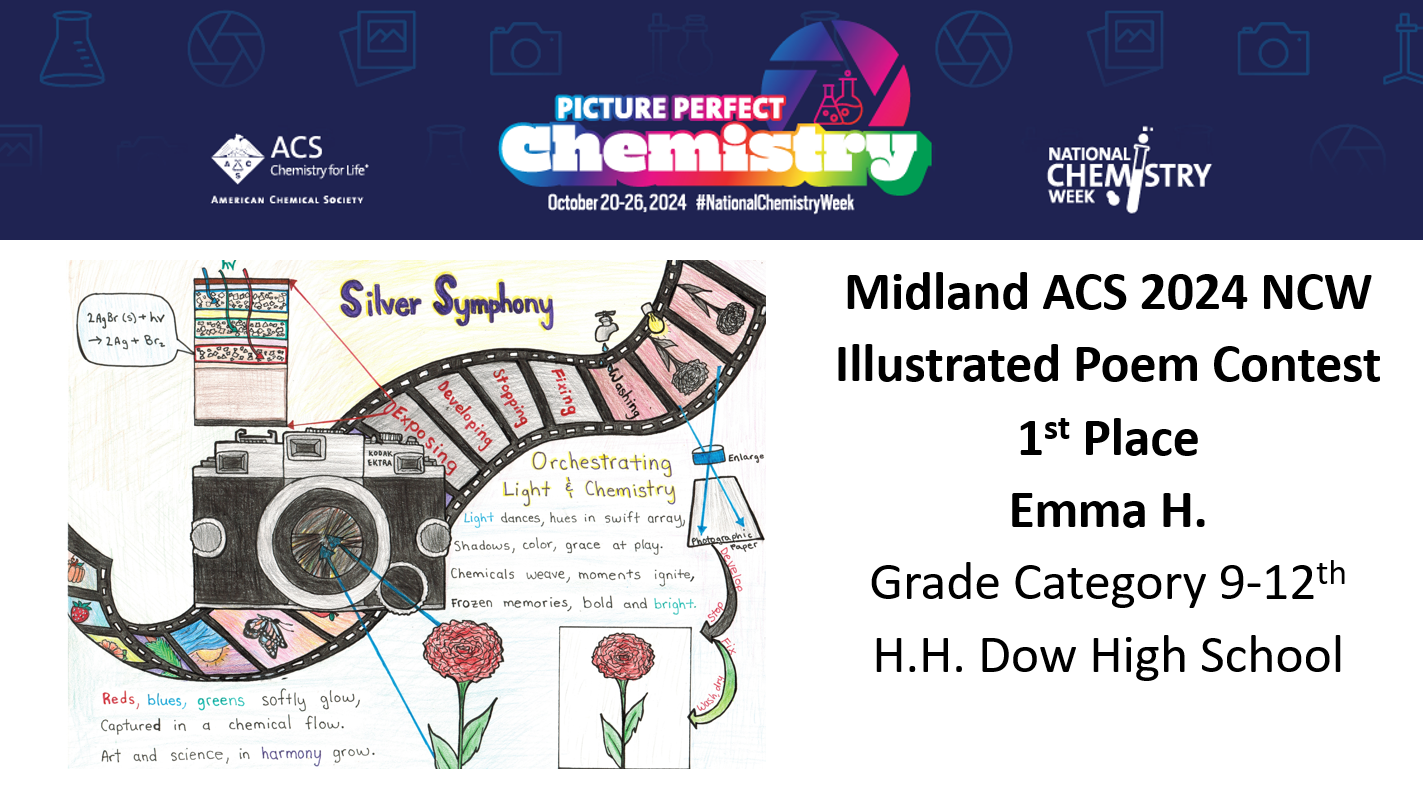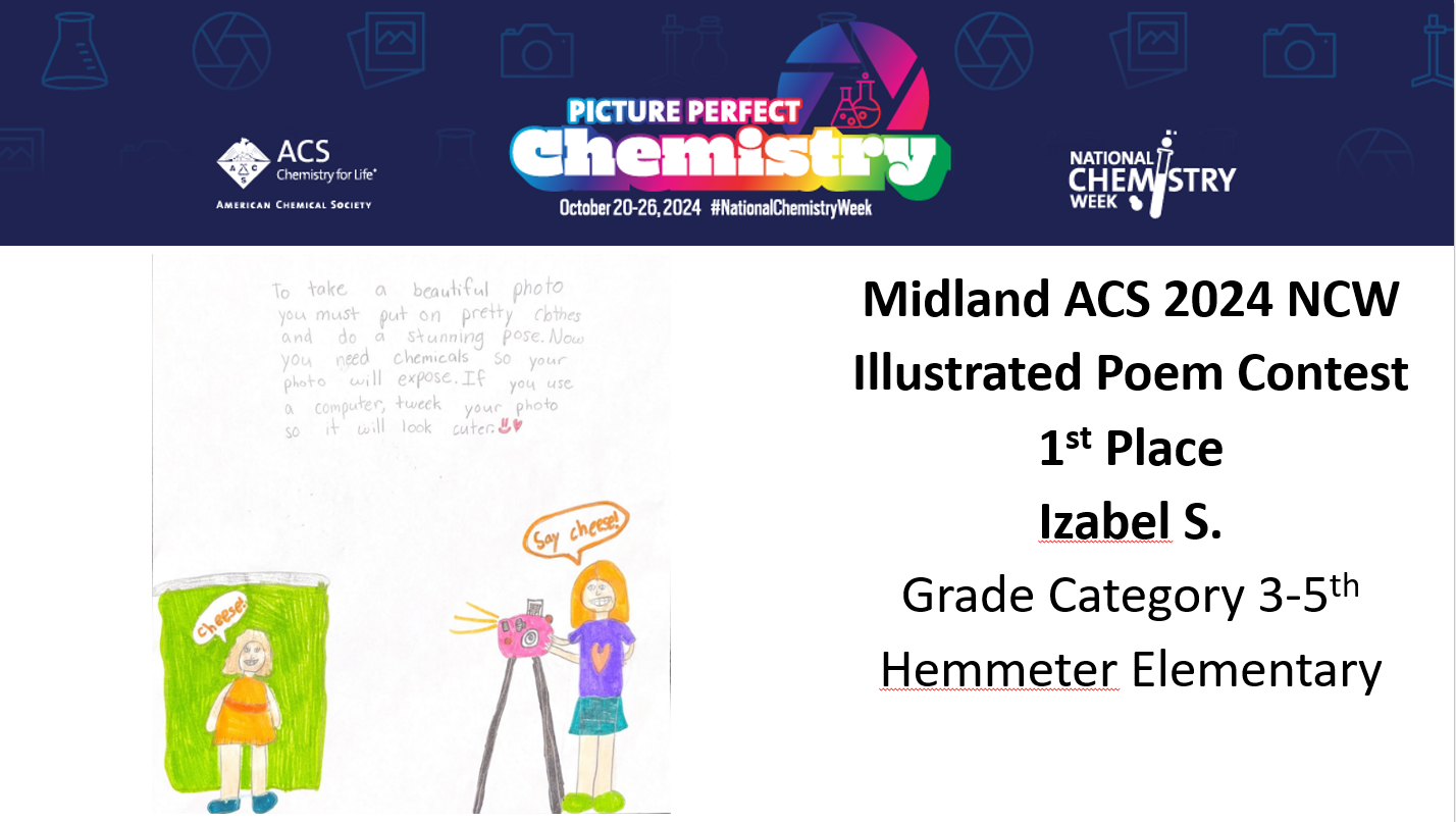 Midland ACS congratulates the winners of our National Chemistry Week (NCW) Illustrated Poem Contest! We received a total of 30 entries and our winners are Izabel S. from Hemmeter Elementary, Claire V. from Woodcrest Elementary, Kaitlyn V. from Jefferson Middle School, Emma H. from H.H. Dow High School and Makayla T. from Swan Valley High School! This year’s theme was “Picture Perfect Chemistry” Congratulations again and thank you to all who participated!