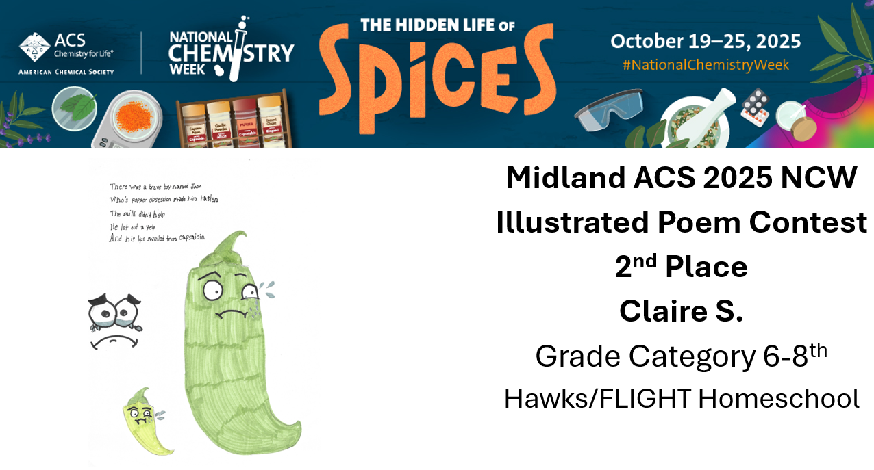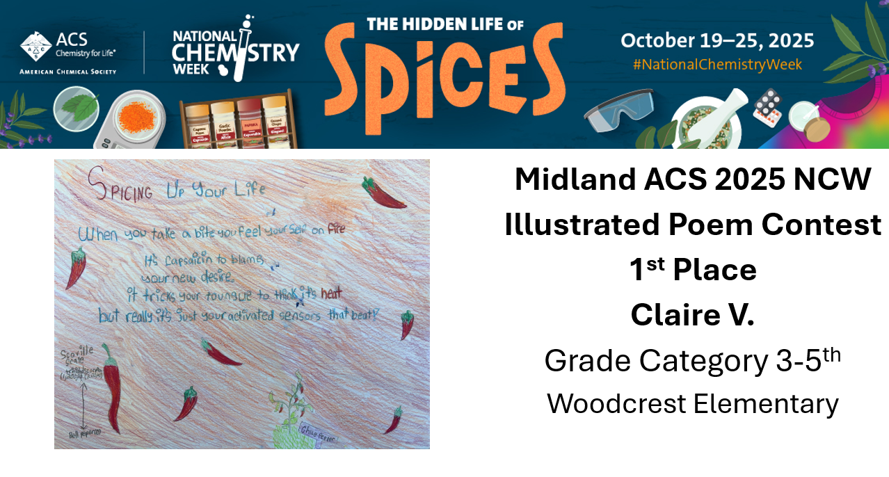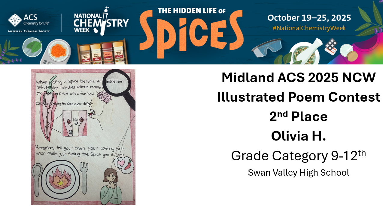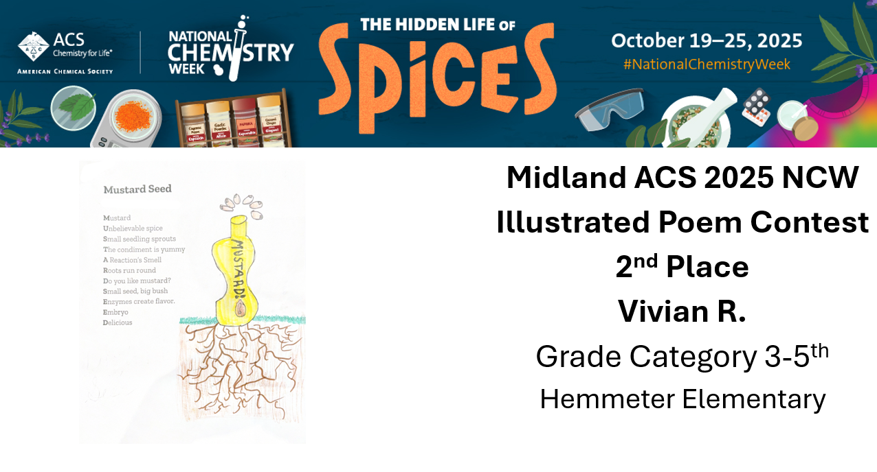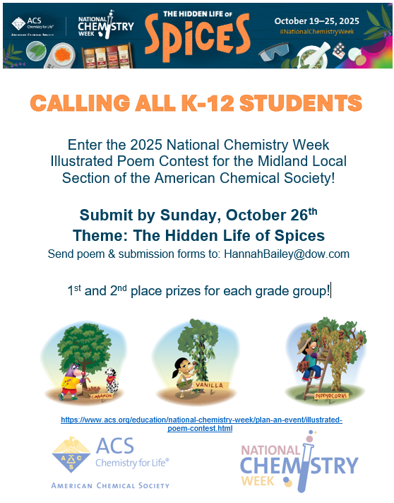 The Midland Local Section of the American Chemical Society (ACS) is sponsoring an illustrated poem contest for students in kindergarten through 12th grade. Write and illustrate a poem using the NCW theme – The Hidden Life of Spices Contest Deadline: Sunday October 26 th , 2025